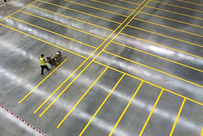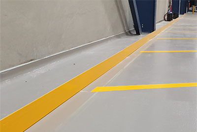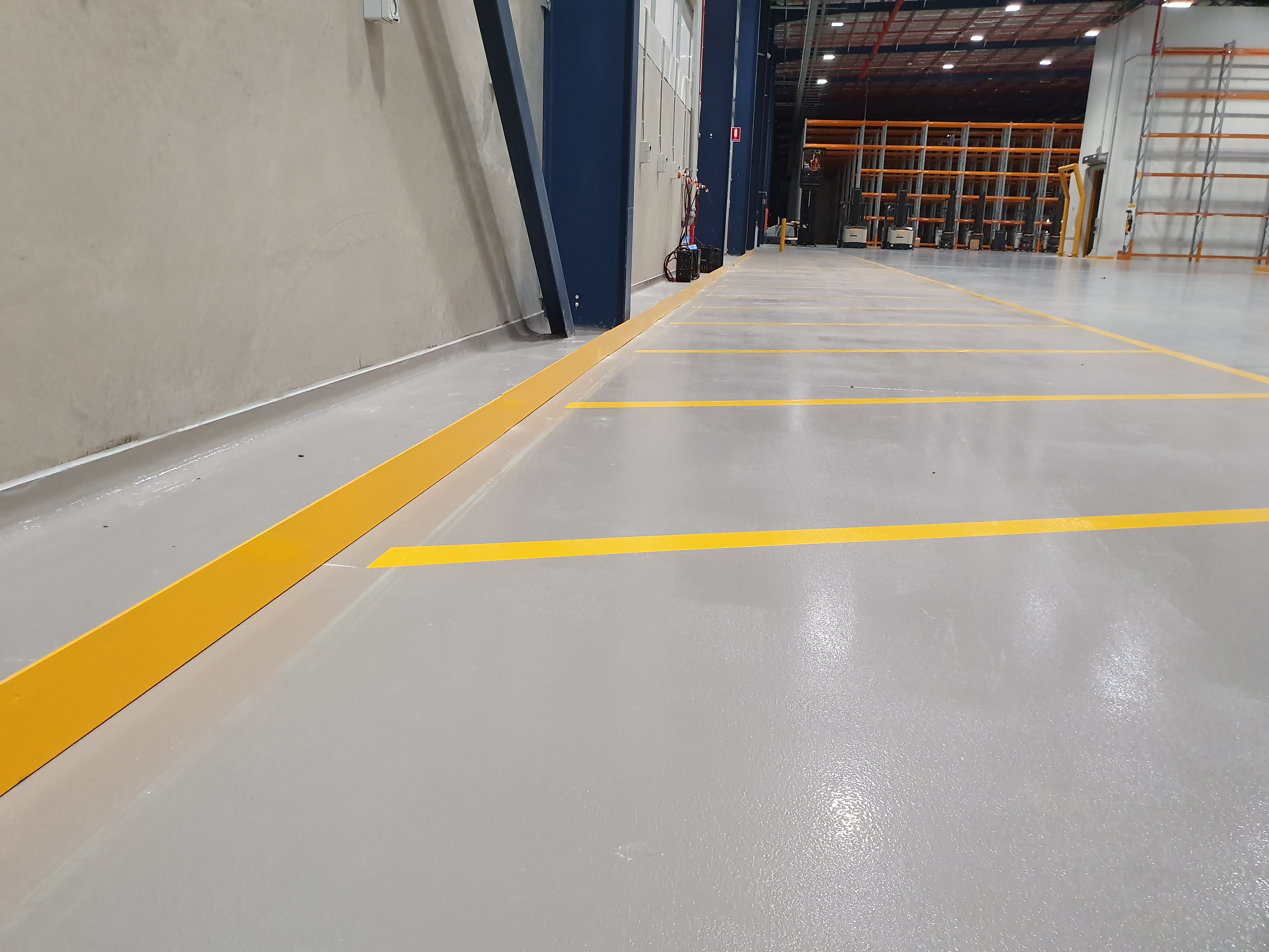 This was all accompanied by several hundred lineal meters of epoxy line marking that we shot blasted first to ensure maximum adherence to the ground. The line marking was used to designate walkways and pallet staging zones found in the warehouse cool room. The forklift charging bays were marked out with epoxy line marking while pallet protection angle was installed parallel to the walls and charging stations to minimise risk of collision.